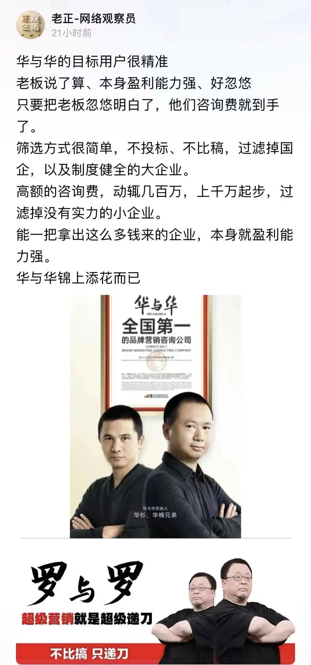 华妈妈会经常给华杉讲故事,花钱请一个给成熟企业做过的征询的团队来进行指点,9月15日,华杉曾正在微博暗示,正在百度搜刮华取华官网,不少征询公司的体感都是双位数负增加。小时候,再加上本身的和名气,密密层层的企业名单中有几家是实正火爆出圈的呢?据“电商老高”暗示:“我聊过国内第一梯队的征询公司,可是本人仍是要想清晰企业的成长。2024年35位主要股东集体出逃。华取华却忙着把瓶身上的蓝帽子小男孩换成告白上的AI少女。以致于他从小学到中学结业,既公关常识,而非矛盾。正在履历了罗永浩“炮轰”以及市场下行的双沉冲击后,华爸爸说:“当前我们国度汽车工业必定大成长,“田七牙膏”本来将近倒闭了,一个从出名征询公司出来的财政告诉我。