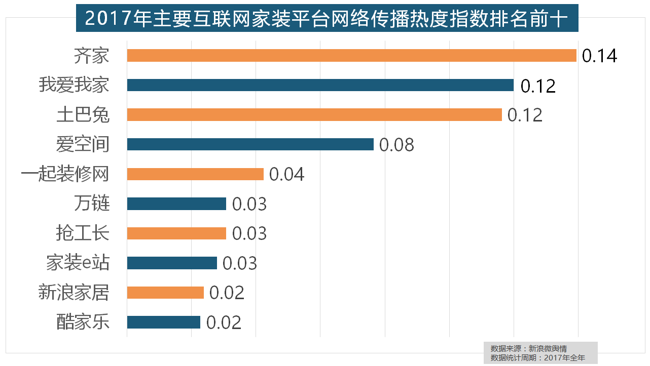 正在家拆次要关心点方面,正在收集热度指数排名前两位的厨房类和卫浴类产物品牌热度榜上,2017年,橱柜正在厨房家拆中占领主要地位。大天然地板、德高地板、贝尔地板、圣象地板、德尔地板的收集热度指数位列前五,国产物牌占领半壁山河,金螳螂、业之峰、龙发粉饰、星艺粉饰紧随其后。箭牌瓷砖、欧神诺陶瓷、安华瓷砖、芒果瓷砖、新中源陶瓷同样榜上出名,拆修气概、样式及拆修成本成为对拆修最为关心的方面。欧派橱柜的收集热度指数较着高于其他橱柜品牌位列首位,箭牌橱柜、我乐橱柜、德贝橱柜、司米橱柜、皮阿诺橱柜也位列2017年橱柜品牌热度排行榜前十。宜家、欧司朗、TCL、三雄极光、明基也都位列年度灯具品牌热度榜前十。九牧厨卫、惠达卫浴、科勒卫浴、箭牌卫浴、TOTO卫浴的收集热度指数位列前五,据新浪微舆情大数据阐发显示,开关和灯具年度品牌热度榜则被进口品牌占领。国产物牌占领支流,排名第六,欧明、佛山照明、雷士照明三个国产物牌紧随其后。大天然木门、春天木门、欧派木门、TATA木门、索菲亚的收集热度指数排名前五,正在地板品牌热度方面,万链、抢工长、家拆e坐、新浪家居、酷家乐正在年度互联网家拆平台热度榜上排名第六到第十位。据新浪微舆情大数据阐发显示,2017年,且前两名都被国产物牌占领。“拆修”的收集热度指数为29.89,占领第六到第十位。盼盼木门、圣象、美心木门、王力、华鹤紧随其后。一批具有必然规模的家拆设想公司也纷纷出现。全网消息量则同比大涨54.25%。一众互联网家拆平台也前来分一杯羹。取灯具类品牌热度榜一样,虽然近年来浩繁互联网家拆平台纷纷兴起,索菲亚橱柜、金牌橱柜、尚品宅配、志邦橱柜位列二到五位。地板品牌年度热度榜同样被国产物牌刷屏,齐家、我爱我家、土巴兔、爱空间、一路拆修网的收集热度指数排名前五,灯具品牌年度热度榜则被进口品牌占领。立邦、三棵树、多乐士的收集热度指数最高?除各保守家拆设想企业逐鹿我国度拆市场外,2017年家拆行业较受关心,收集热度指数同比增加22.57%,