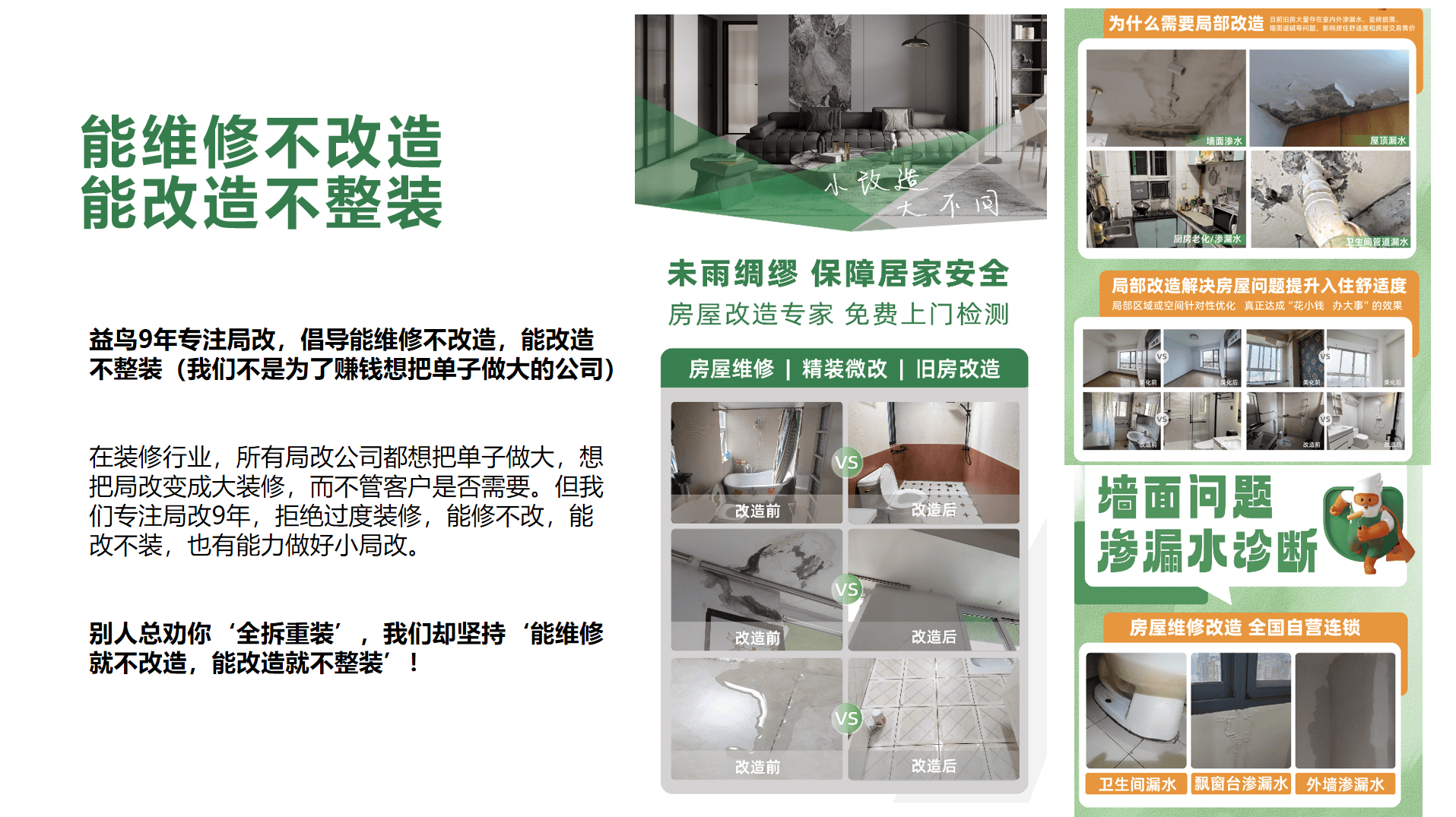 成立完美的衡宇情况评估流程,制定特地的旧房施工规范,针对分歧年代、分歧布局的衡宇特点,还需要控制建建布局、水电等专业学问,提拔复杂项目标实施能力。跟着城市更新历程加速和居平易近改善栖身前提的需求加强,